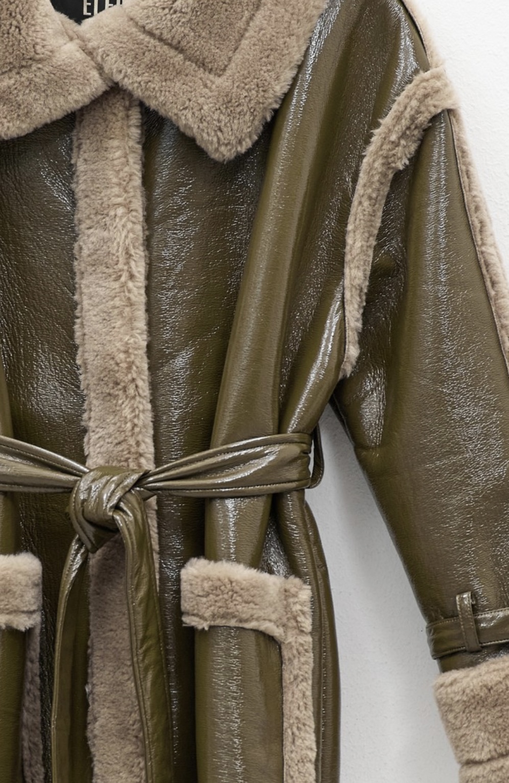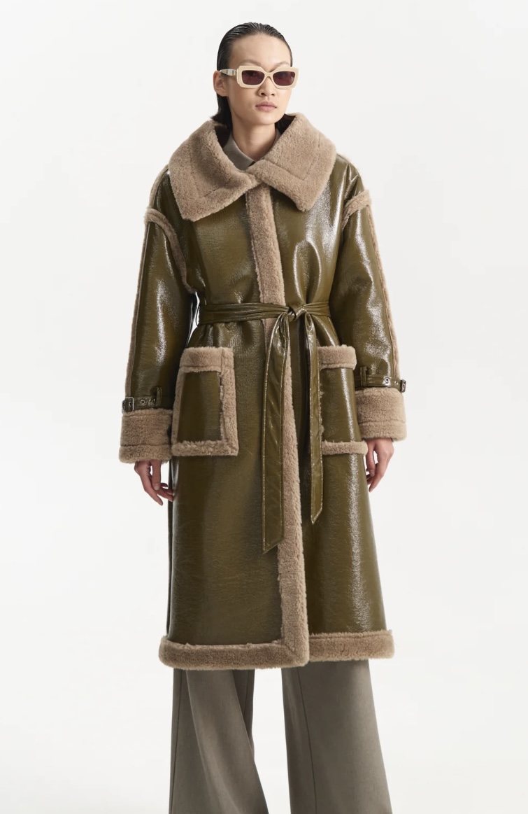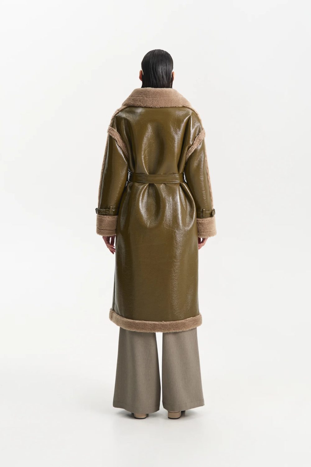 Ilgas chaki spalvos paltas su diržu – išskirtinis ir modernus pasirinkimas šaltajam sezonui. Modelis dekoruotas kontrastinėmis minkšto audinio detalėmis ties apykakle, rankogaliais ir kišenėmis, kurios suteikia jaukumo bei prabangos įspūdį. Diržas leidžia reguliuoti siluetą – galima dėvėti laisvai krentantį arba paryškinti liemenį. Puikiai dera tiek prie kasdienių, tiek prie elegantiškų derinių.