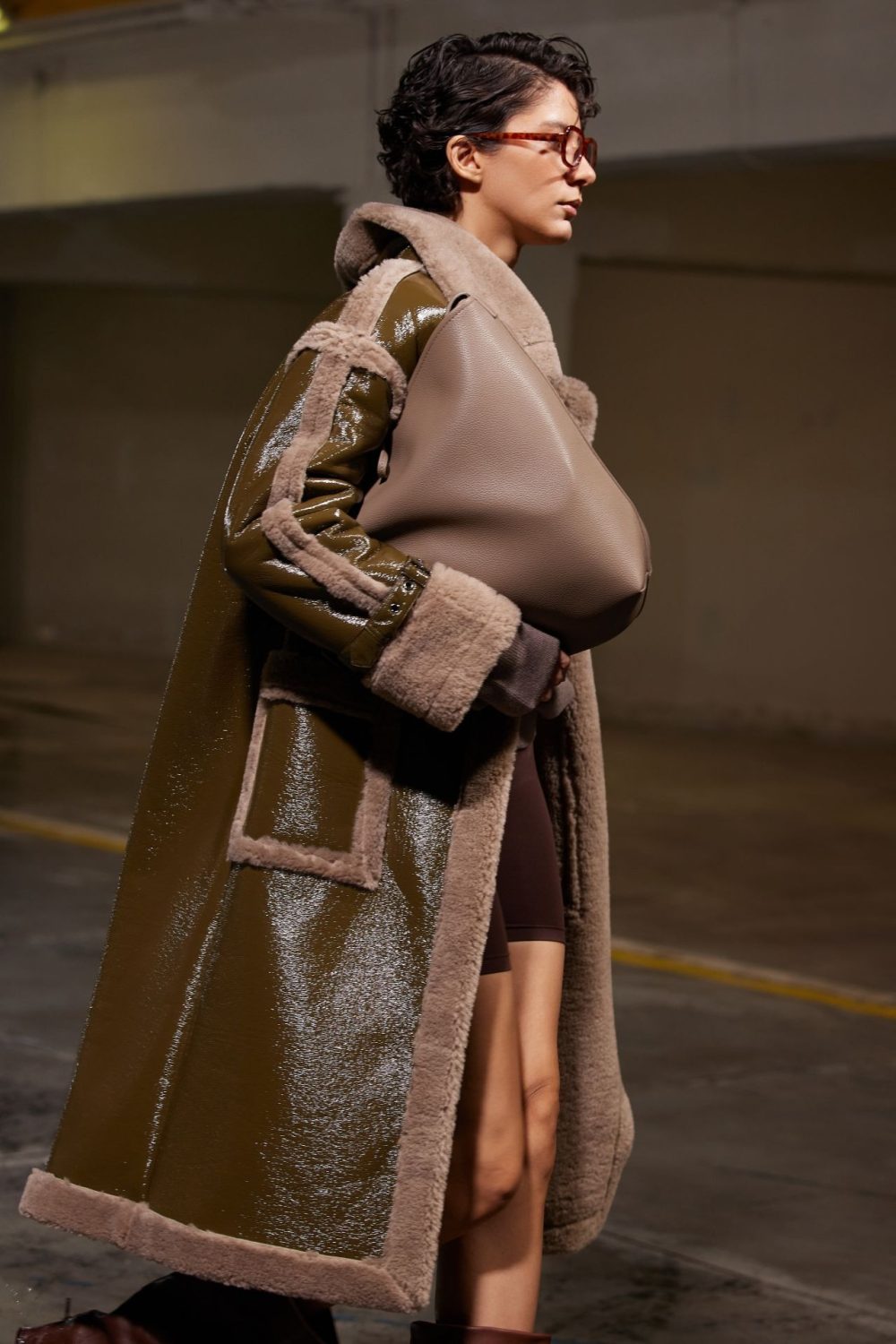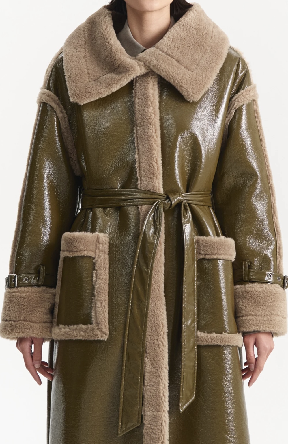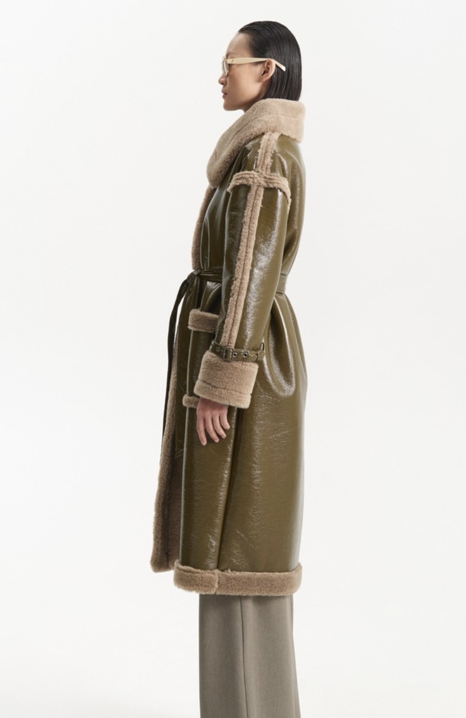 Ilgas chaki spalvos paltas su diržu – išskirtinis ir modernus pasirinkimas šaltajam sezonui. Modelis dekoruotas kontrastinėmis minkšto audinio detalėmis ties apykakle, rankogaliais ir kišenėmis, kurios suteikia jaukumo bei prabangos įspūdį. Diržas leidžia reguliuoti siluetą – galima dėvėti laisvai krentantį arba paryškinti liemenį. Puikiai dera tiek prie kasdienių, tiek prie elegantiškų derinių.