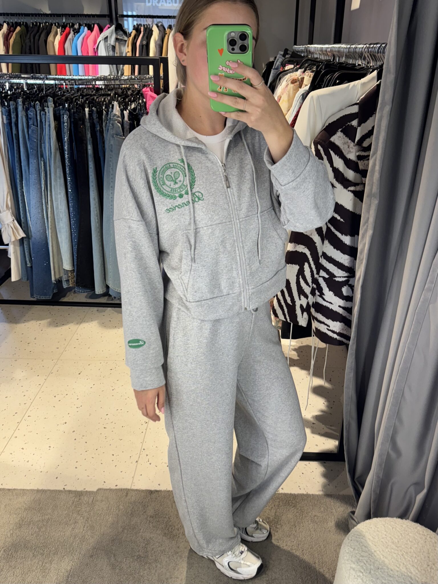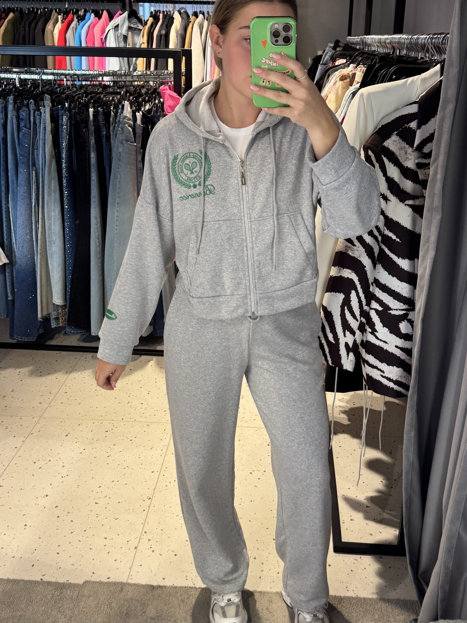 Džemperis trumpinto modelio, kelnės aukštu liemeniu. Kelnių galai susitraukia su guma.