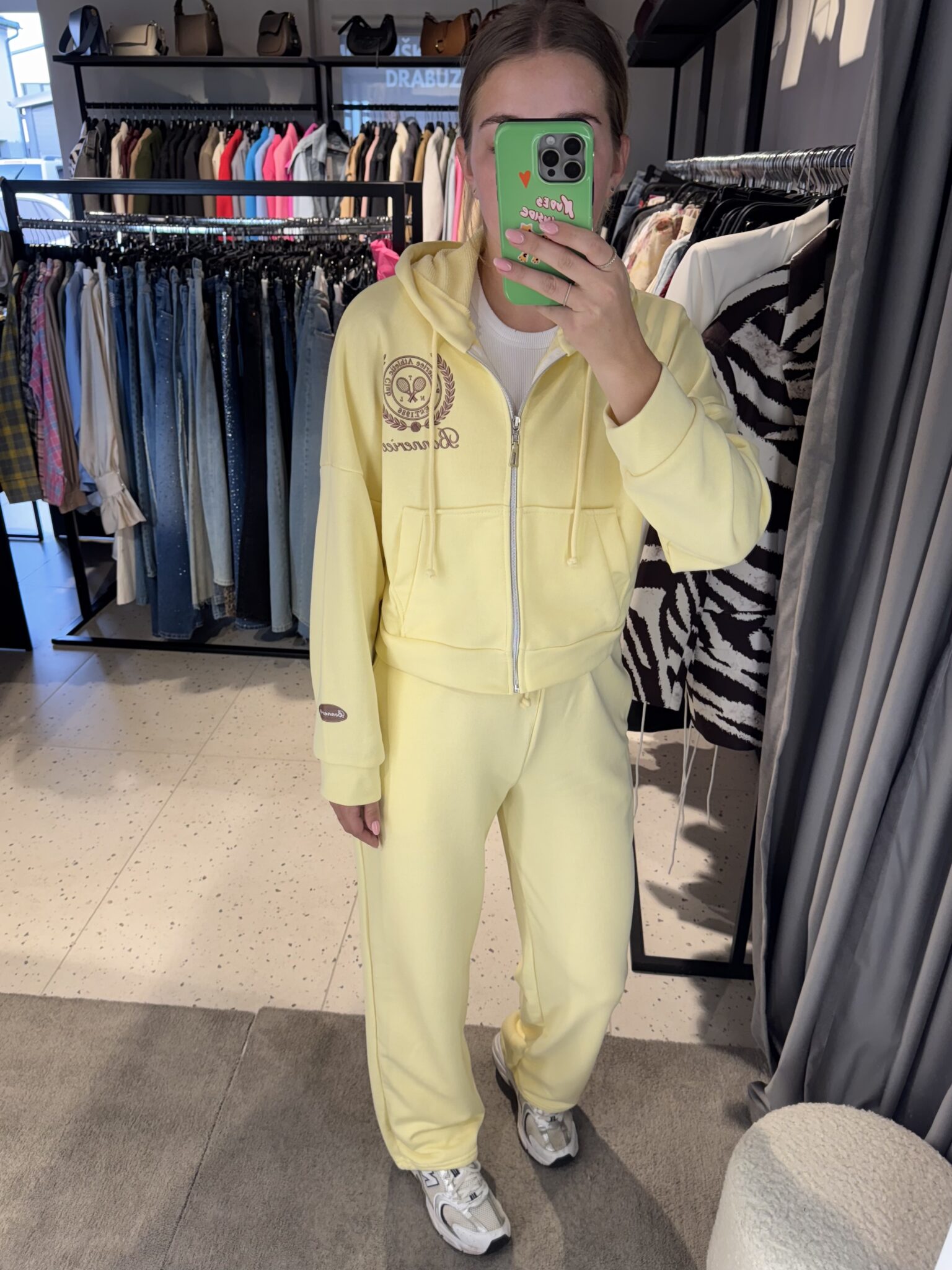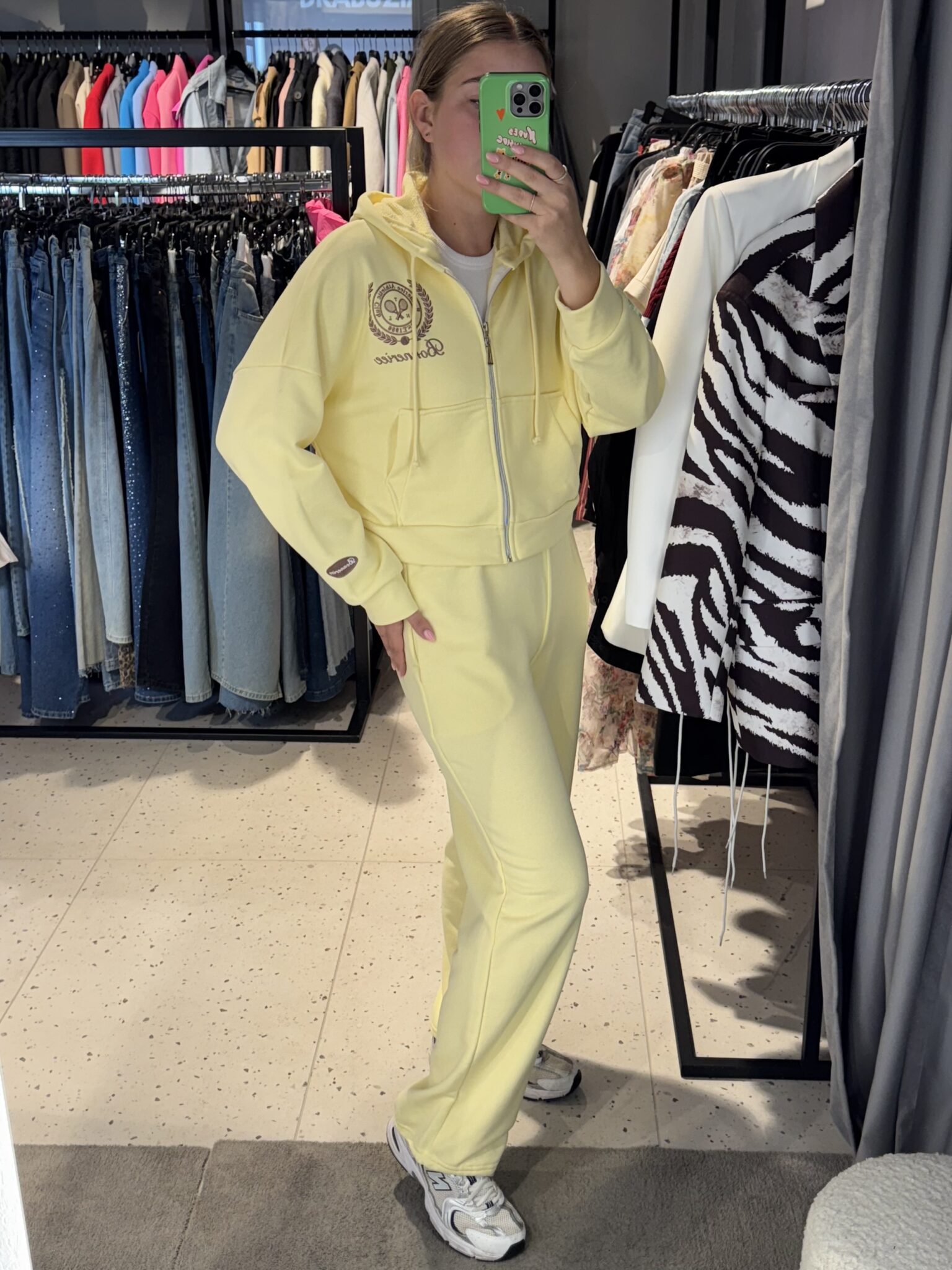 Džemperis trumpinto modelio, kelnės aukštu liemeniu. Kelnių galai susitraukia su guma.