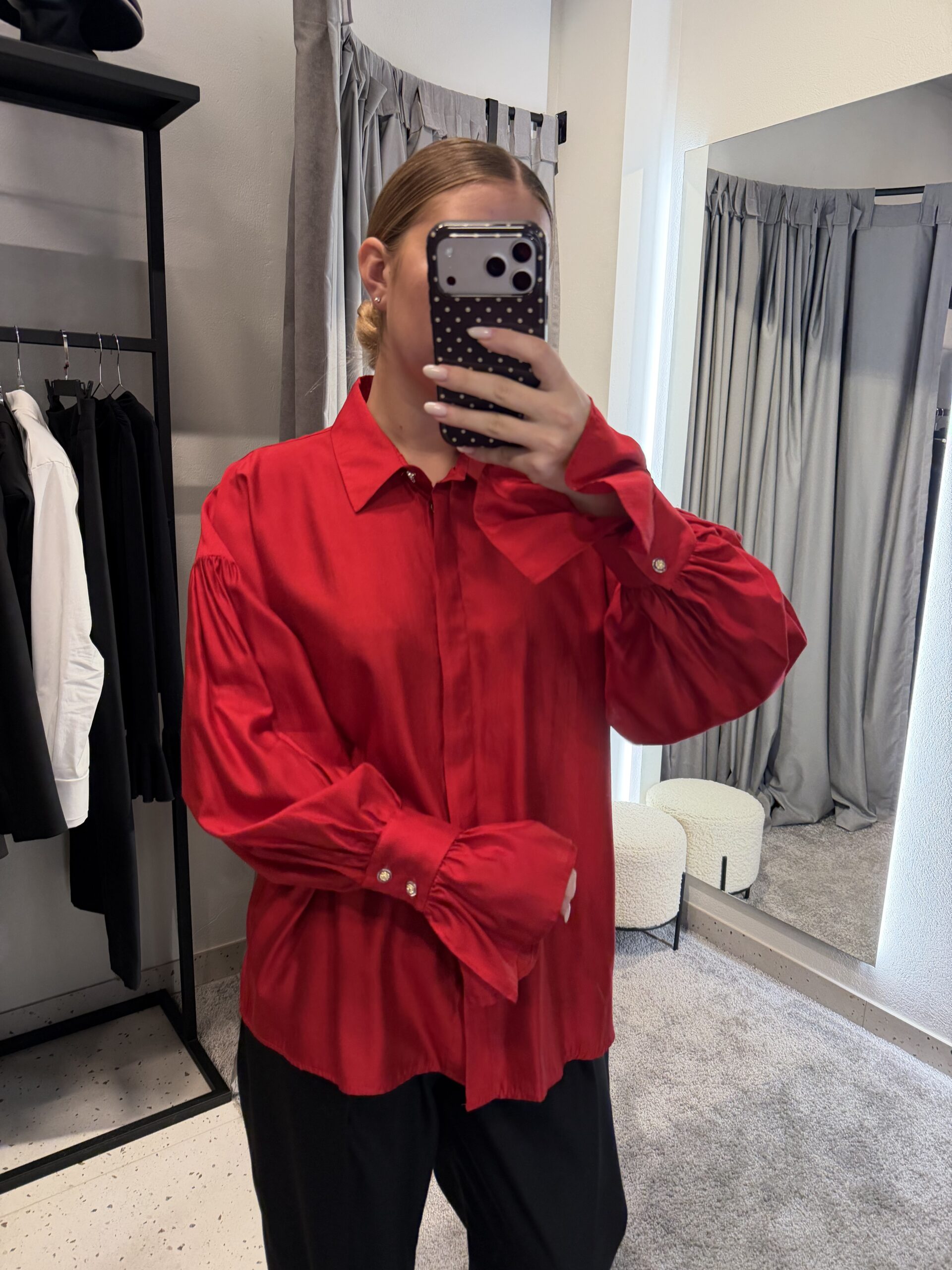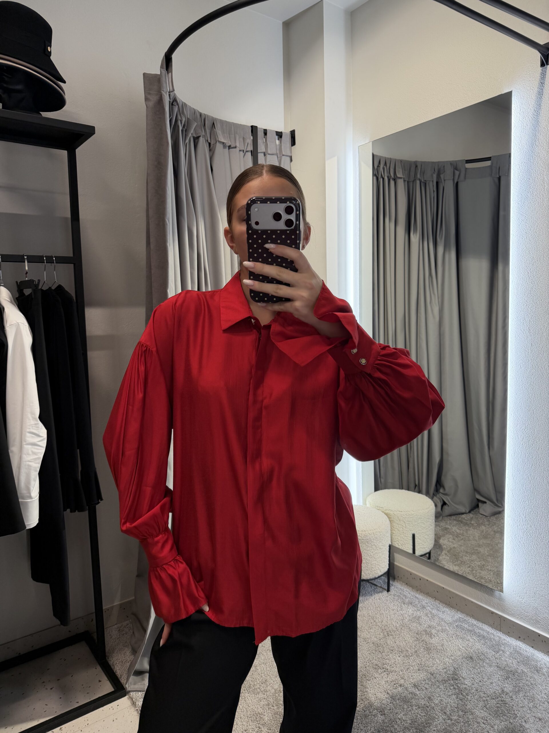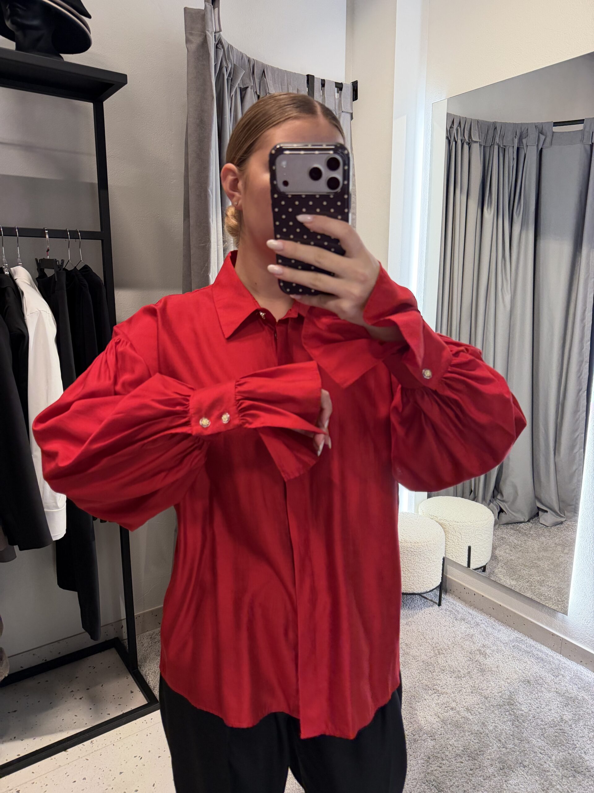 Ryškūs raudoni marškiniai laisvo silueto, su išskirtine detale ant rankovių – stilingas pasirinkimas, kuris prideda charakterio kiekvienam deriniui. Lengvai krentanti medžiaga suteikia komforto ir nevaržo judesių, todėl šie marškiniai puikiai tinka tiek kasdienai, tiek šiek tiek elegantiškesniems deriniams.