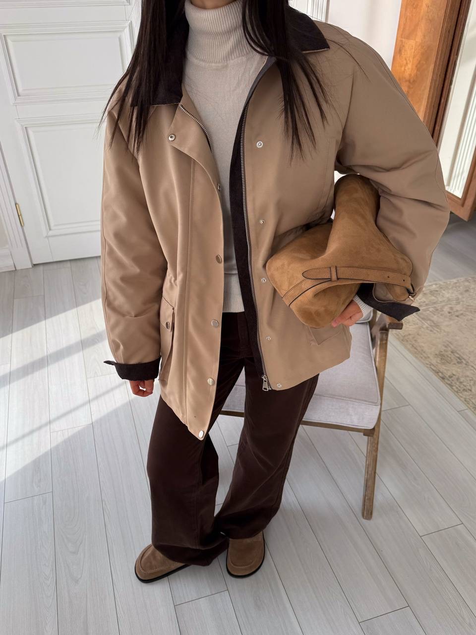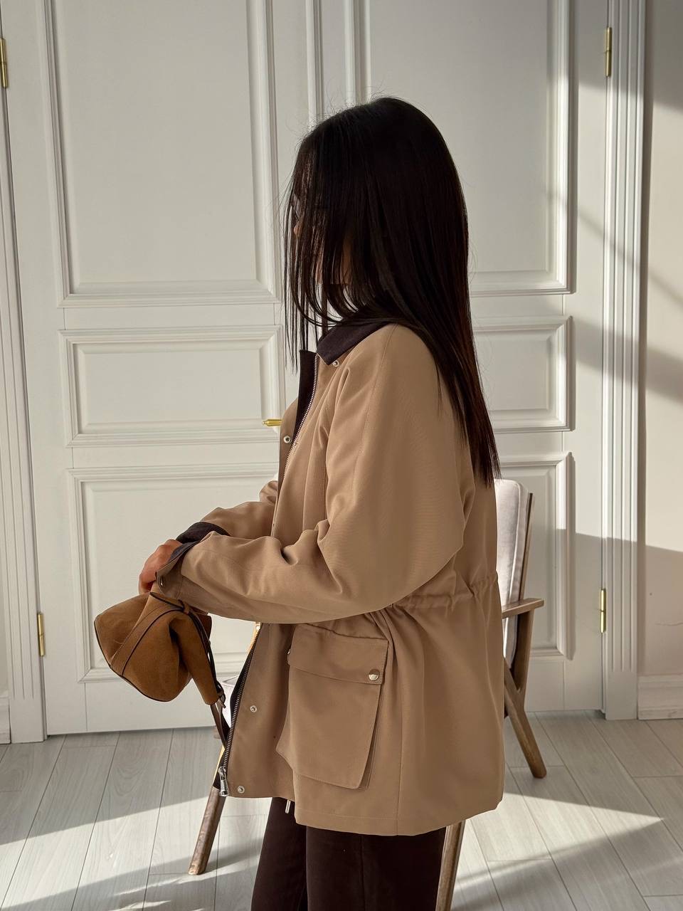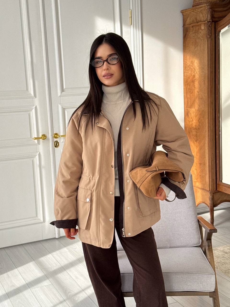 Smėlio spalvos striukė – elegantiškas ir lengvai derinamas pasirinkimas vėsesniam orui. Tiesaus kirpimo modelis suteikia patogumo, o reguliuojamas liemuo leidžia gražiai paryškinti siluetą. Kontrastinga apykaklė suteikia išskirtinumo, o užsegimas užtrauktuku ir spaudėmis bei praktiškos kišenės užtikrina patogumą kasdienai.
