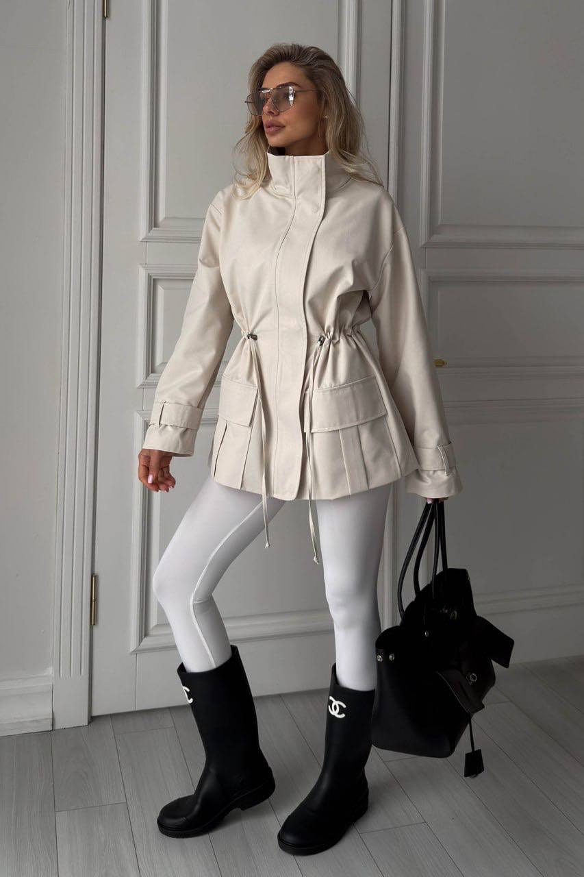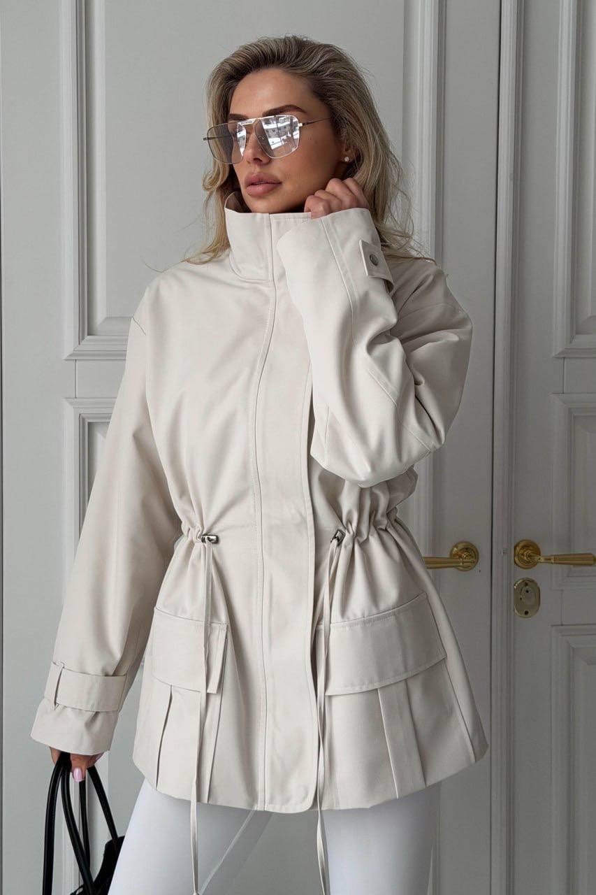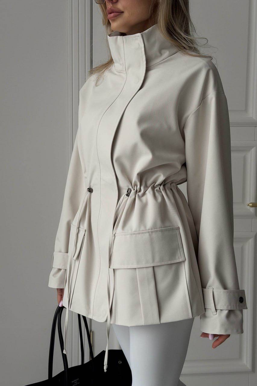Striukė iš lietpalčio tipo audinio – stilingas ir patogus pasirinkimas kasdienai. Laisvo silueto modelis su stačia apykakle, užtrauktuku ir spaudėmis, o reguliuojamas liemuo leidžia gražiai paryškinti siluetą. Modelį papildo kišenės su atvartais.