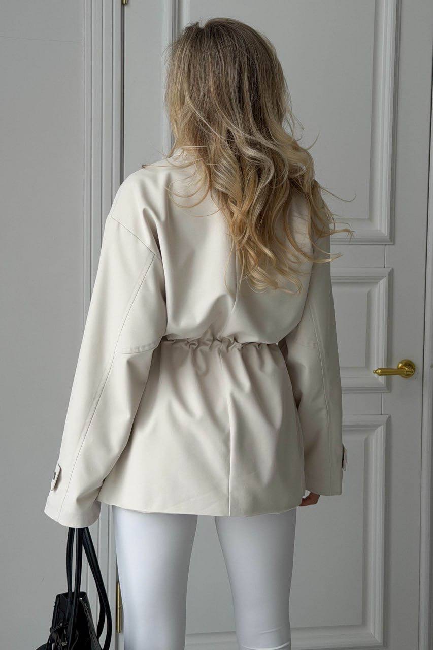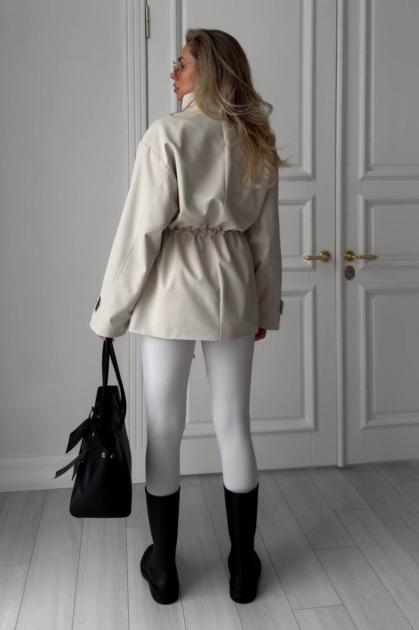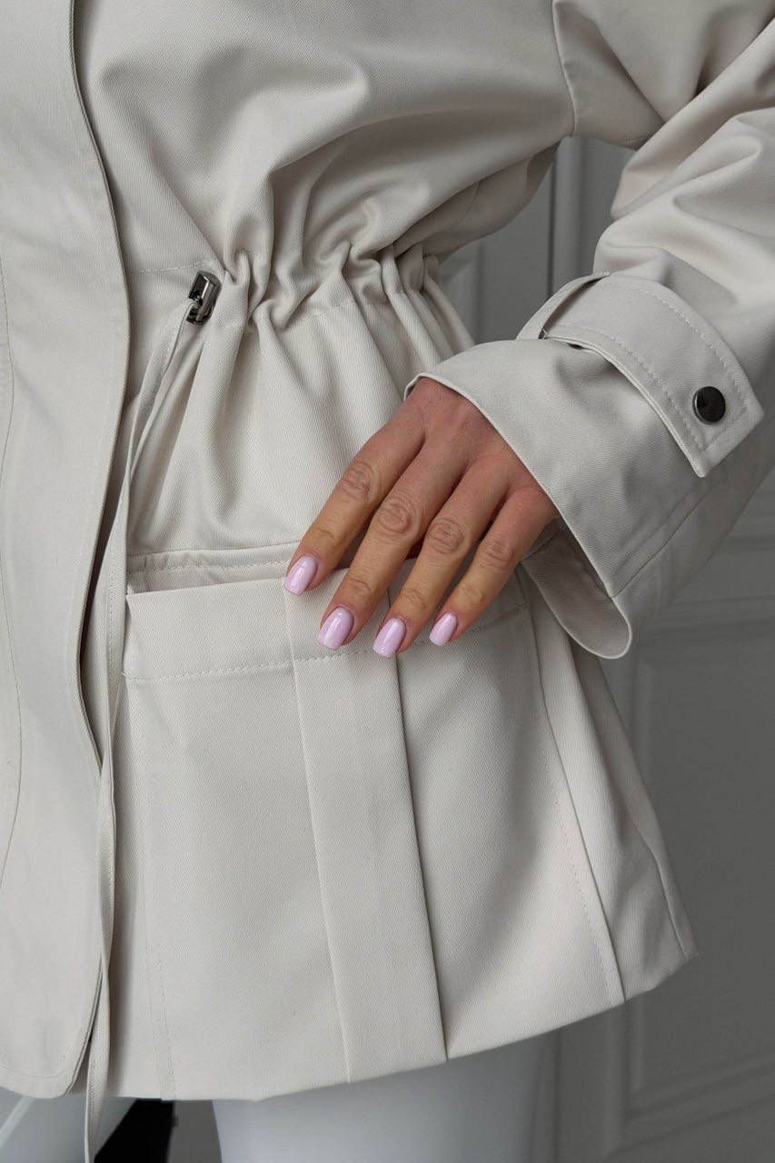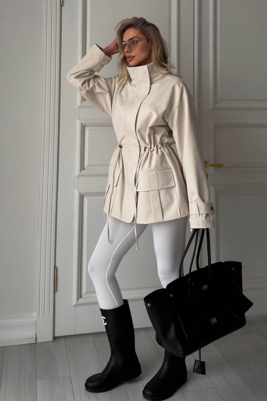 Striukė iš lietpalčio tipo audinio – stilingas ir patogus pasirinkimas kasdienai. Laisvo silueto modelis su stačia apykakle, užtrauktuku ir spaudėmis, o reguliuojamas liemuo leidžia gražiai paryškinti siluetą. Modelį papildo kišenės su atvartais.